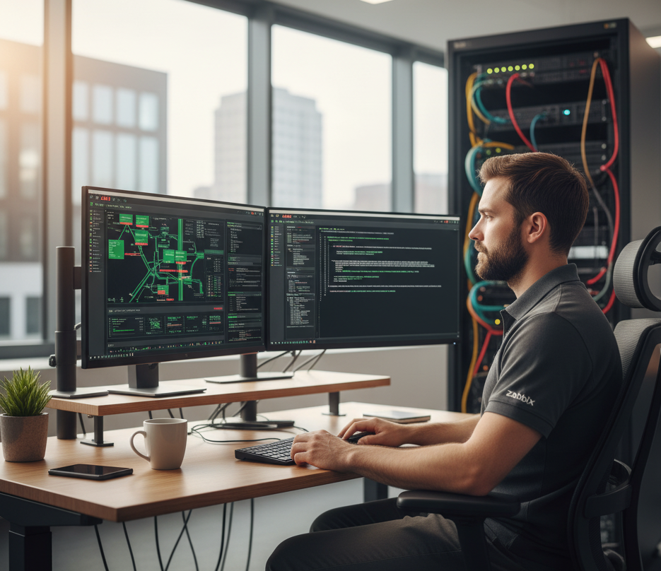 • Zarządzanie Siecią: Administracja aktywnymi elementami sieci LAN/Wi-Fi (switche, routery, AP), w tym segmentacja (VLAN) i optymalizacja ruchu.
